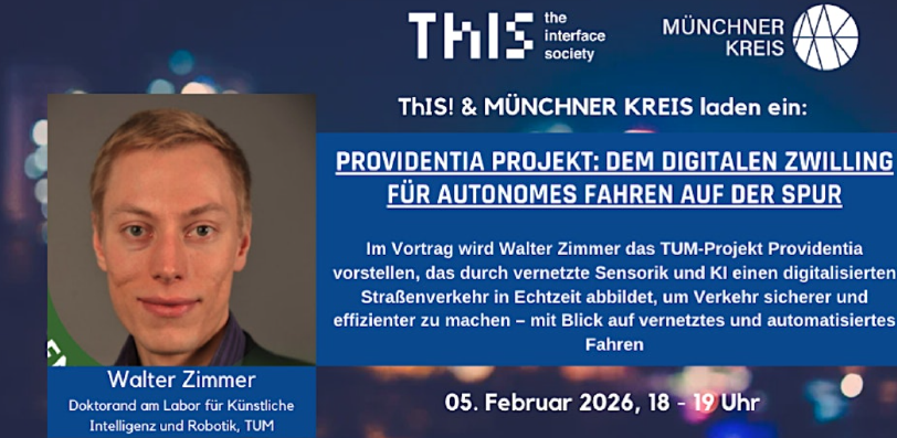 In our Smart City series, we are focusing this time on the Providentia project, which has developed a digital twin for autonomous driving. Dr. Walter Zimmer, postdoctoral researcher at the University of California Los Angeles (UCLA) and visiting scientist at the Artificial Intelligence and Robotics (AIR) Laboratory at TUM, will give the presentation and provide exciting insights into the development of a digital twin for autonomous driving. Walter Zimmer, postdoctoral researcher at the University of California Los Angeles (UCLA) and visiting scientist at the Artificial Intelligence and Robotics (AIR) Laboratory at TUM, will give the presentation and provide exciting insights into the project and current developments.